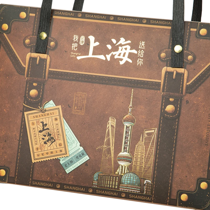 বাক্সের পৃষ্ঠে ট্রেনের টিকিট এবং পুরানো লেবেলের মতো বিপরীতমুখী উপাদানগুলির সাথে "আমি আপনাকে সাংহাই দিচ্ছি" এর মতো একচেটিয়া পাঠ্য প্রিন্ট করে৷ এর নিজস্ব শহুরে সাংস্কৃতিক বৈশিষ্ট্য রয়েছে। এটি শুধুমাত্র প্যাকেজিং নয় একটি সংগ্রহযোগ্য শহরের স্যুভেনিরও। এটি সাংহাইতে স্থানীয় বিশেষত্ব এবং সাংস্কৃতিক পণ্যগুলির জন্য একটি একচেটিয়া উপহার বাক্স হিসাবে উপযুক্ত, যা আঞ্চলিক সংস্কৃতিকে বোঝায়।