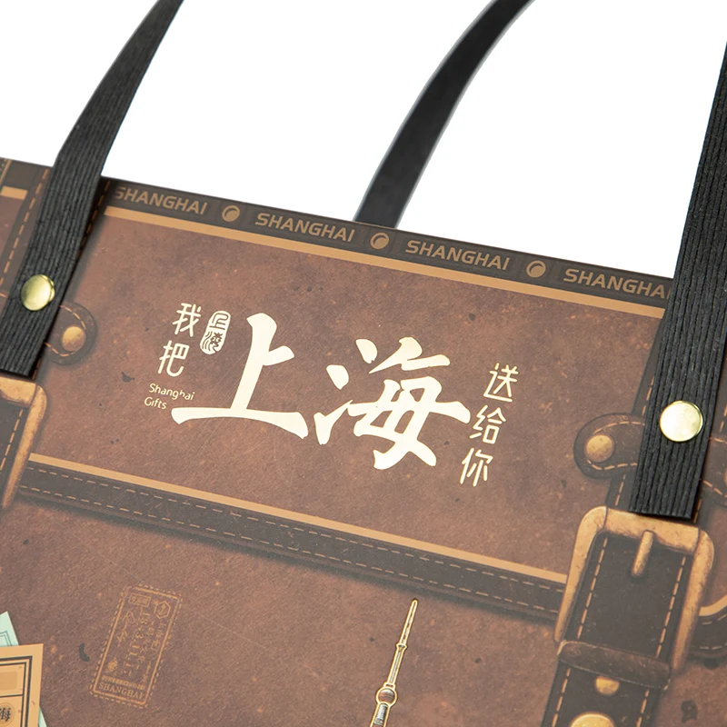 মেইলিং গিফট পেপার বক্স একটি পুরানো দিনের স্যুটকেসের চেহারা অনুকরণ করে। It uses an aged brown base color and features faux leather rivets and belt buckles, along with gold-embossed patterns of city landmarks such as the Oriental Pearl Tower and the old streets of Shanghai. এক নজরে, এটি পুরানো সাংহাইয়ের নস্টালজিক স্মৃতিকে উদ্ভাসিত করে, এটিকে সাধারণ উপহারের বাক্সগুলির মধ্যে আলাদা করে তোলে। উপহার হিসাবে দেওয়া হোক বা প্রদর্শনের জন্য, এটির একটি শক্তিশালী মেমরি পয়েন্ট রয়েছে।